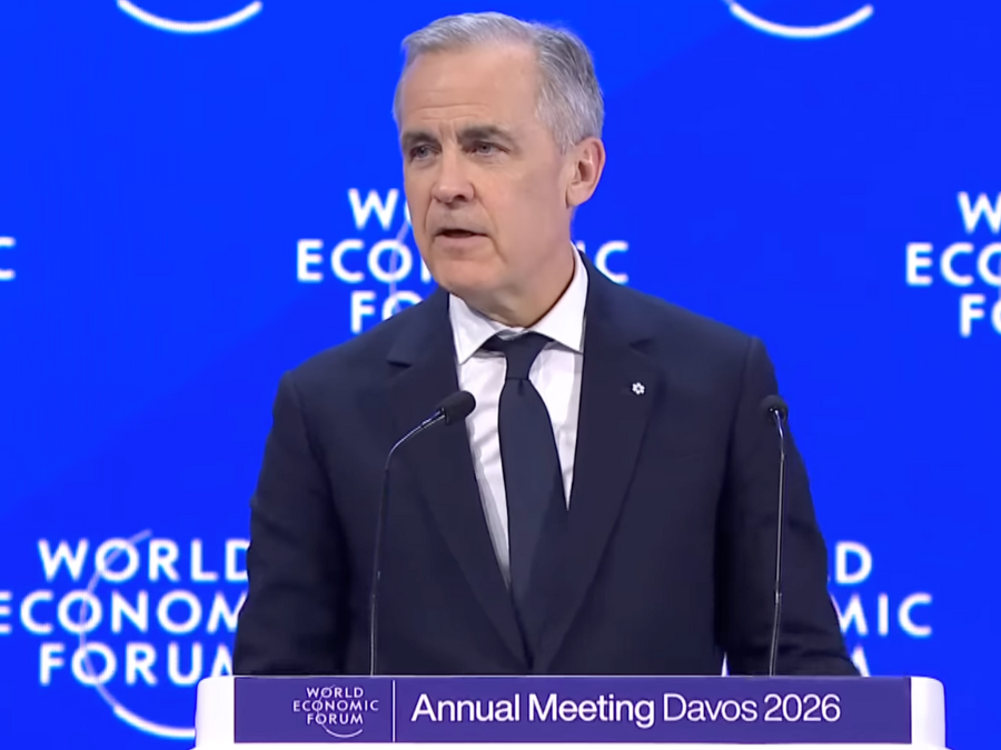 Prime Minister of Canada Mark Carney makes a speech at the World Economic Forum in Davos, Switzerland on Tuesday, Jan. 20, 2026. During his speech, Carney said that the illusion of a rules-based international order had vanished. (Screenshot: Youtube)